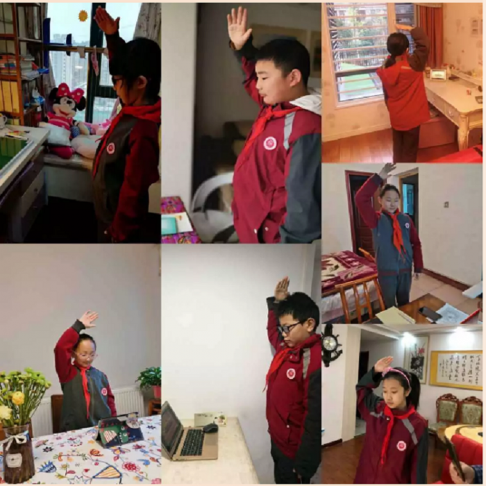 当雄壮的国歌响起,当鲜艳的五星红旗冉冉升起,同学们身着整洁的校服,戴着鲜艳的红领巾,对着屏幕庄严敬礼,和家长一起唱响嘹亮的国歌。