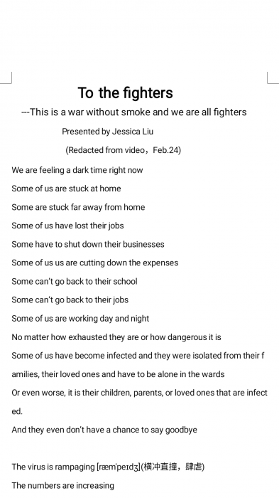 高三年级的陈桂蓉老师将“抗疫”与高三语文备考相结合,联系时事原创命制语言文字运用题,如:对“用挖断公路等方法实施封闭管理,防疫指挥部及时纠偏”进行新闻评述;将《人民日报》,《光明日报》等权威媒体的时评文章引入课堂,创设探讨时事情境,进而引导学生作文训练,并全批全改,逐个点评。