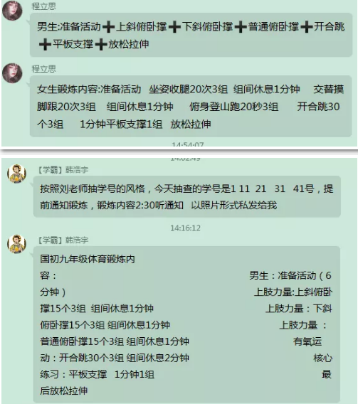 除了班长,904班的体育委员程立思和韩浩宇同学也以身作则引领大家每日进行体育锻炼,同时承担起在群里布置锻炼内容、抽查学号、督促大家完成的任务,让大家养成了每日锻炼的好习惯。