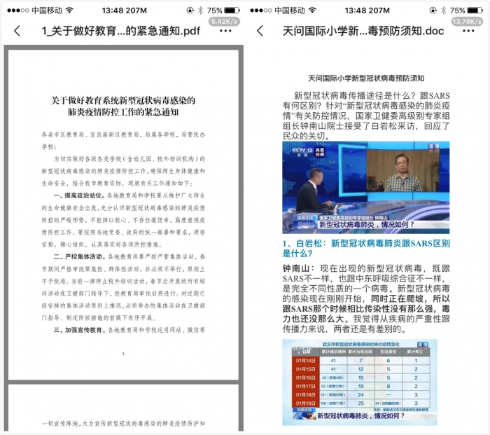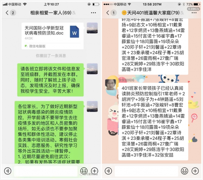 我校利用学校和班级QQ群、微信群等多种途径向师生及家长第一时间转发市教育局《家庭、小学及托幼机构、大专院校、职业技术学校及初高级中学新型冠状病毒感染的肺炎预防控制指引》、《天问国际小学新型冠状病毒预防须知》、《抗击疫情,天问国际小学和你在一起》等内容。