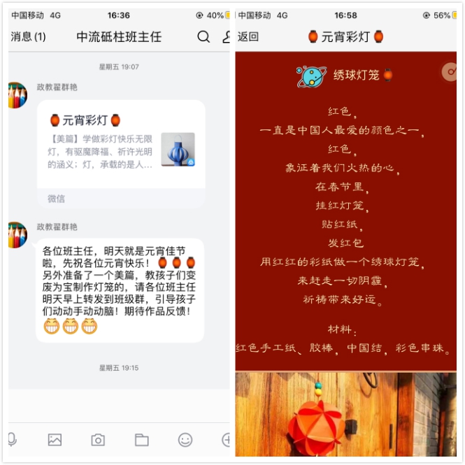闹花灯是元宵节传统节日习俗,始于西汉,兴盛于隋唐。灯,有驱魔降福、祈许光明的涵义;灯,承载的是人们对美好生活的向往与追求;灯,寄托了我们的祝福与美好愿望。有灯无月不娱人,有月无灯不算春。美术组翟群艳老师制作《元宵彩灯》美篇,教孩子们变废为宝制作灯笼。彩纸灯笼、绣球灯笼、兔子灯、牛奶盒灯笼、塑料瓶花灯,各色创意彩灯应有尽有。孩子们和爸爸妈妈一起,动手做一盏花灯,点亮一个希望。