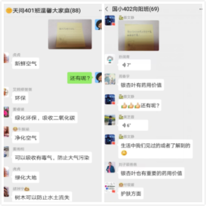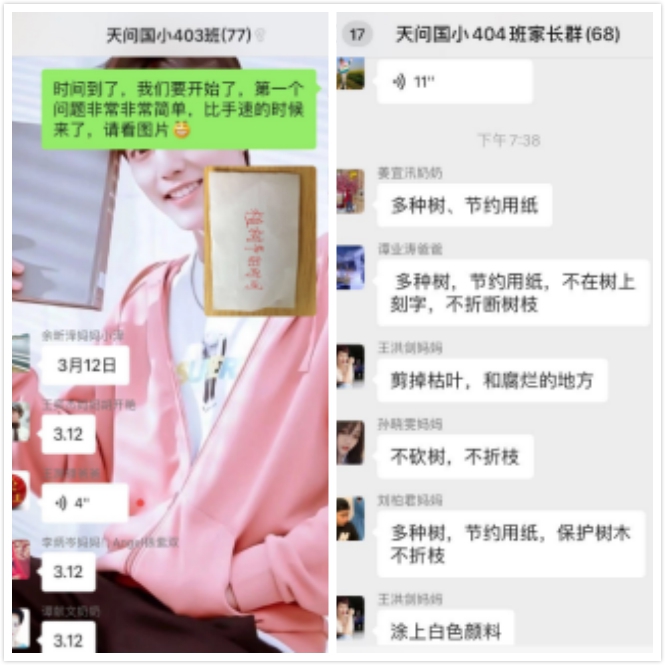 各班群里举行"战疫情 守绿意"的植树节知识竞答活动,回答问题环节中,学生们积极回答线上学习植树节相关内容,加深了学生明白了植树造林,为祖国增添一抹绿。关注绿化、环保的重要性,不践踏草坪、不破坏树木,从我做起,从身边的小事做起。爱护环境,不乱丢垃圾,节约用纸,尽量少使用塑料袋、一次性碗筷等。爱护野生动物,爱惜一草一木。向家人、同学宣传环保理念。倡导绿色文明。争做“环保小使者”。