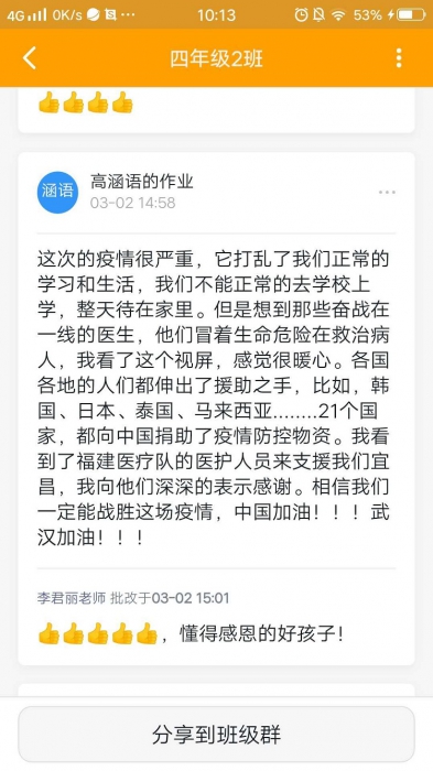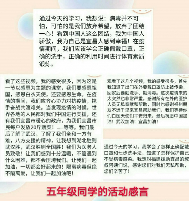 在道德与法治课堂中,老师利用短视频让孩子们自主学习,并穿插讲述了一些在疫情期间发生的暖心故事,带领学生在地图上找到宜昌、福建的位置实实在在的感受福建医疗队来宜昌路途遥远,更感受他们无私忘我的奉献精神!孩子们深受触动,用笔和视频记录下了自己的感受。