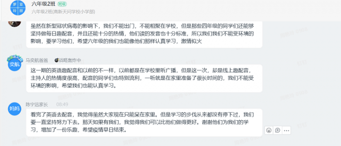 本期校园英语“云”广播推出后,受了全校师生和家长们的好评。在新小又掀起了一股学习英语的浪潮,孩子们纷纷在班级群里表示,要向这些优秀学生代表学习,坚持口语,让说英语成为一种自然而然的流露。