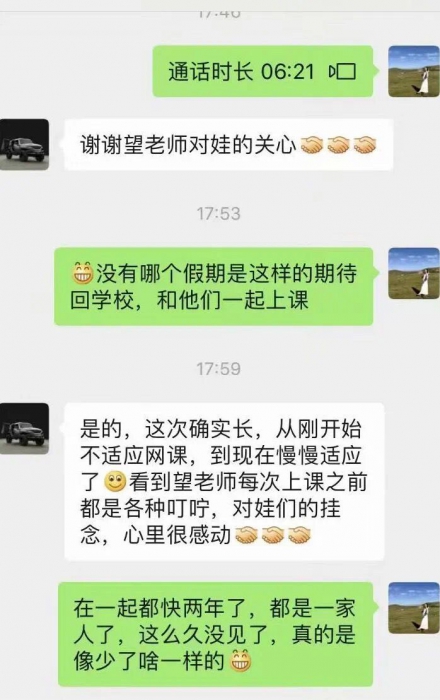 202班班主任望书敏老师成为了线上的“心理医生”,每天下午固定时间和名额,依照学号顺序与班上的学生视频聊天。学生们将近期所见所闻,所思所想,学习困惑一股脑的向她倾诉,她一律笑盈盈的作答。一周下来,班上每个孩子都与她单独聊过天,家长们反映孩子们与老师聊天变得更加阳光自信。