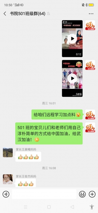 501班黄梓涵妈妈在抖音上与梓涵开展亲子互动,并提议老师与学生的分别拍摄“加油”视频,形成了师生之间良好的远程互动。
