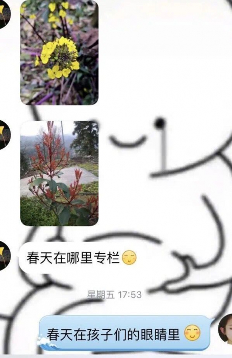 401班覃玉婷老师,带领学生开展“找春天”活动,孩子们将自己眼中的春天拍成照片与老师分享,活动的开展既帮助孩子放松心情,保护视力,也培养了孩子们的观察能力和人文素养。