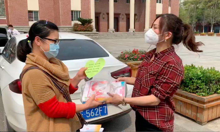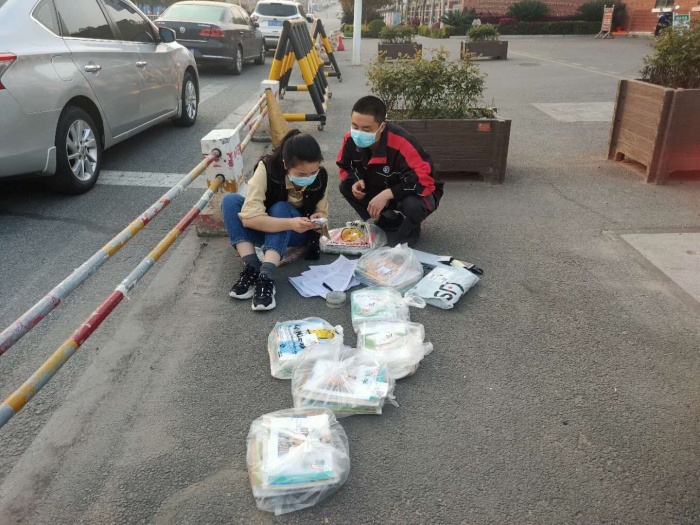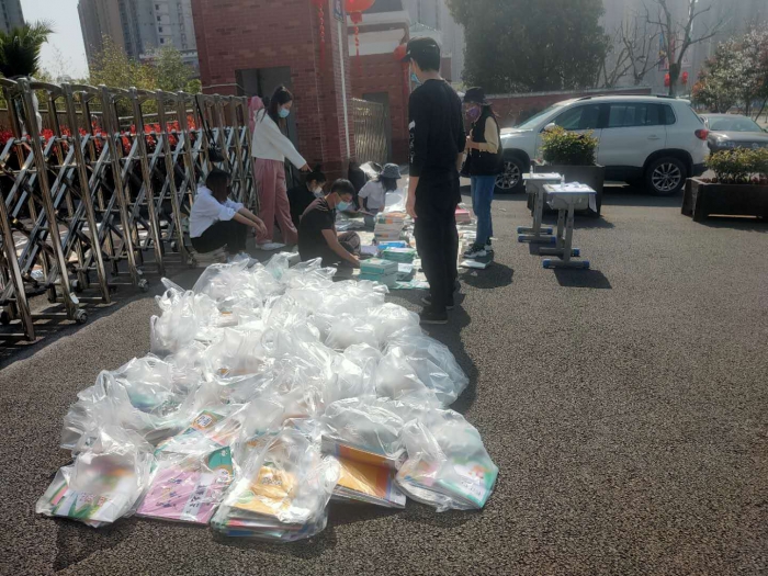 同时,学校也考虑到有特殊情况的学生,教务处采取送、寄等方式将教材发放到每个学生手中。下午6点半,阮允老师还在整理第二批需要快递教材的学生名单。已经忙了一整天的她早就累的直不起腰了,只能坐在地上与快递员接洽。毕巧萌、黄鹏程老师本来还在老家家中,接到派送任务后立即连夜赶到宜昌学校,再马不停蹄开车回去将书本送给外地学生。