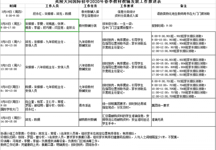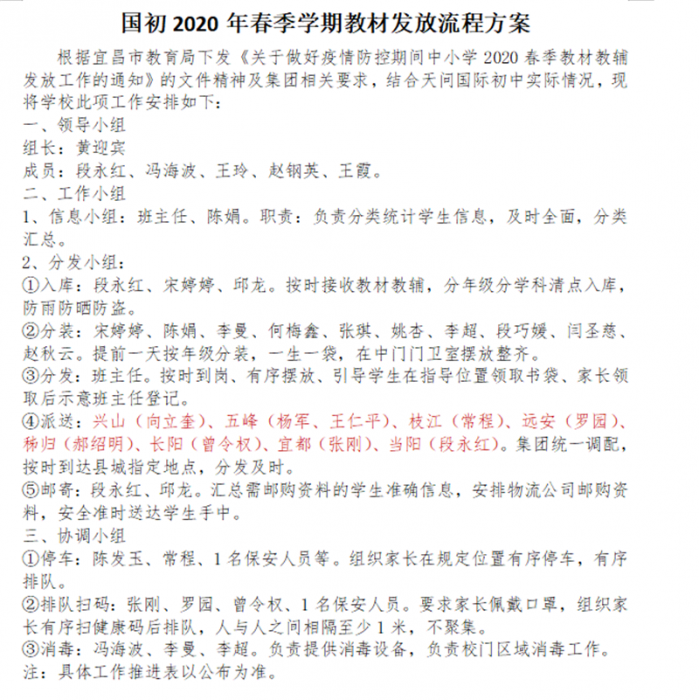 为了方便学生上网课和复习,宜昌市教育局决定将纸质教材发放到学生手中。接到通知文件后,天问国际初中迅速制定了详细的教材发放方案及操作流程,对人员分工及发放方式进行了周密安排。