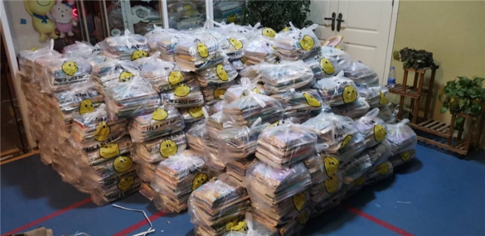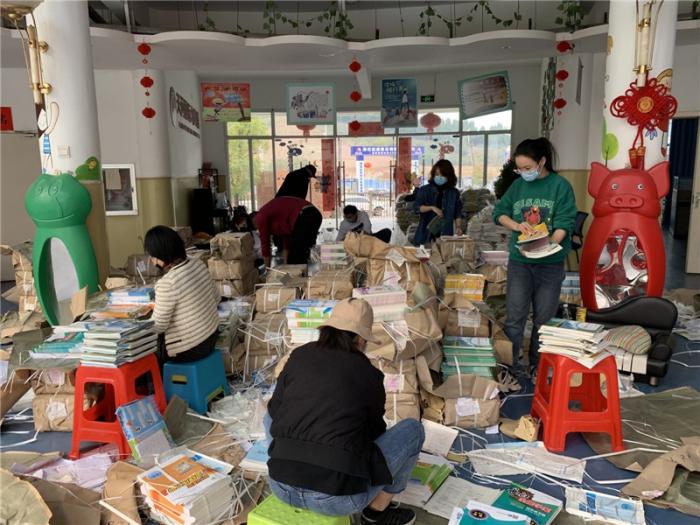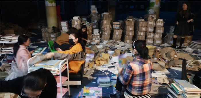 一切工作就绪,平日里精致的美女老师们一个个早已散乱不堪,汗流浃背,手上黢黑,手背上被新书划到的小口子、磨破的防护手套、断裂的指甲……都见证着这一天的辛苦和不易,还有三位女老师要连夜开车返回枝江。回家时,才发觉腰酸背痛,胳膊肿得已不是自己的了。而三万多本书却按年级、按学科分类做到了“一人一袋”,摆放整齐,确保能完整无误地发放到每一个学生手里。
