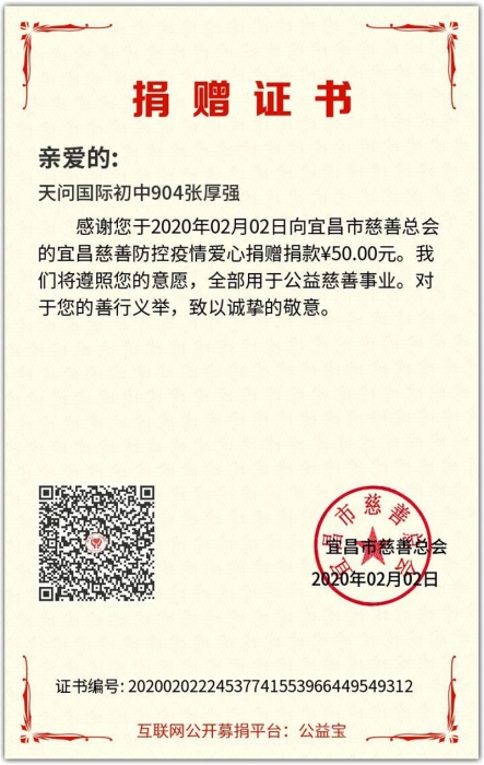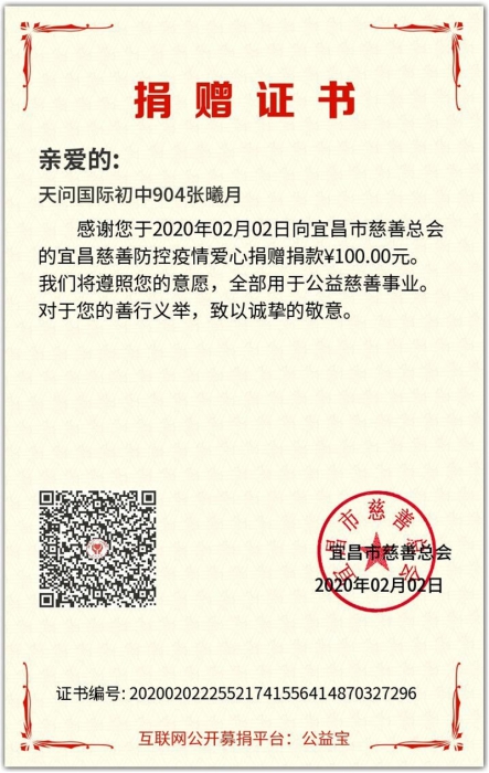 其实,起初是不太顺利的。因为只有两个人,各方面的条件都不足以达到良好宣传效果,但是渐渐的,在我们分享了自己的想法之后陆续又有三个小伙伴加入我们,我们一起组成了“天问爱心小分队”,并创建了微信群。五位小伙伴分工明确,精诚合作,共同制定计划方案。首先,我们确定了宣传海报和宣传方式,然后我们分别在qq空间和朋友圈进行转发,呼吁大家一起参与。这一爱心活动很快引起大家的广泛关注。不出半小时,转发量就突破了50次。越来越多的同学开始捐款,有的拿的是自己积攒已久的零花钱,有的拿的是手还没摸热乎的压岁钱。金额不限,但温暖无限。就在当天晚上,我们的公告发布不到5小时,但捐款数额已经多到600多元。我们马不停蹄就将当日所有捐款资金移交给了宜昌慈善总会,以便他们调配。我们还将捐赠证书下发给捐赠的同学作为鼓励,期望他们能够继续为公益事业贡献自己的力量!