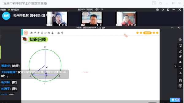 在会议中,首先欣赏了两节高质量的网课。曾在我校任职现就职宜昌市第27中学的周俊老师的《应用题复习课》和天问李胜辉老师的《圆的计算与证明复习》。