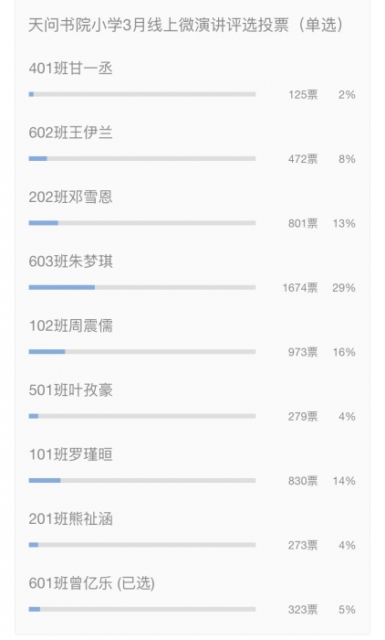 3月下旬,学校再次把评审权交给大众,采用微信投票的方式,评选出101班罗瑾晅、102班周震儒、603班朱梦琪三位同学为月冠军。