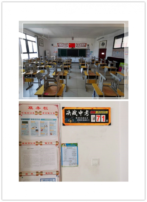 廖胜东校长召开多次行政领导会议,商议开学后具体事宜。教室桌椅如何摆?进餐每桌坐多少孩子?进餐时间如何安排?每个寝室住多少学生?经过多次讨论决定,原8人一间的寝室入住方式改为3人一间,寝室内设置24小时值班医务室。初三的6个教学班分为12个教学班。班主任们将教室打扫得窗明几净,教室黑板旁边统一张贴上开学防护指南、疫情防控知识和学生健康监测流程图、七步洗手法。