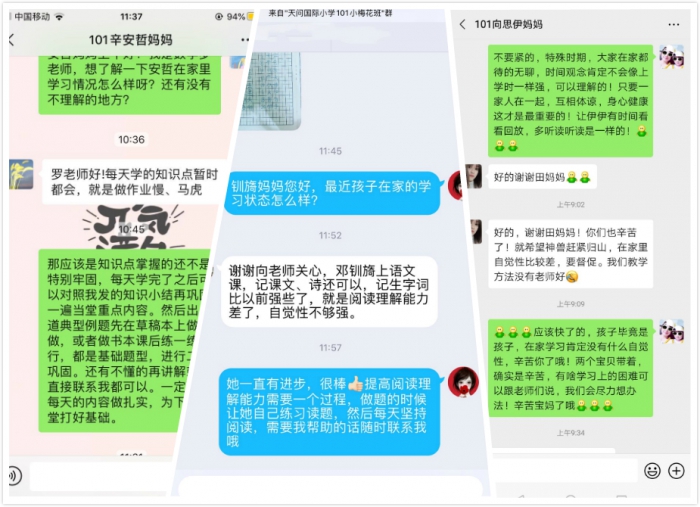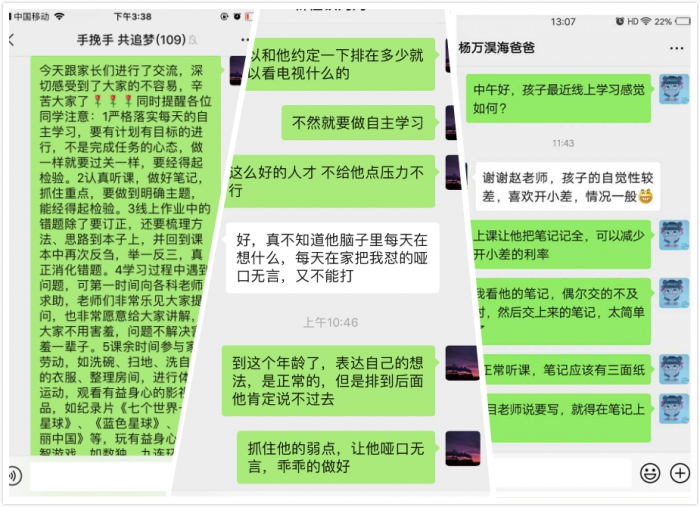 603追梦班的三位老师与全班家长开起了线上“育儿讲坛”。老师们了解了家长的付出与不易,并且提醒同学们用严格自律来落实每天的学习任务,提高学习效率;课余时间注重体育锻炼,参与家务劳动。家长们对老师的细致关爱和专业建议深表感谢,愿意和老师们一道,助力每一个心中有梦的孩子怀揣梦想,扬帆起航!