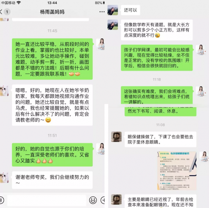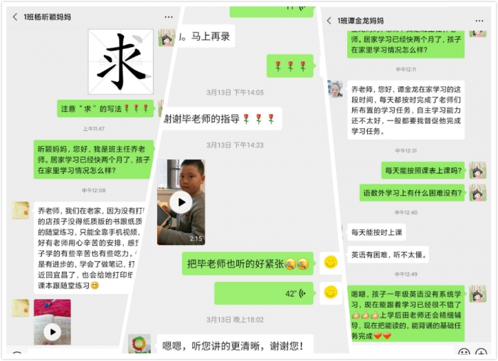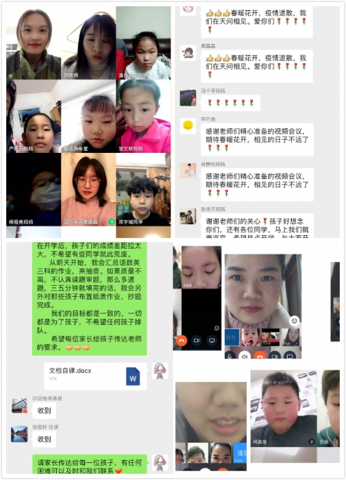 502、504班提前根据学生学习和生活情况将学生分成三个大组,语数英老师分组与家长线上视频交流。老师可以针对性给予专业的教育策略指导,家长们可以互相交流,了解同龄孩子情况。通过视频连线的方式,家长们更加感受到了沟通的真实性,也感受到了老师们对孩子们的关心,这是一次心与心的交流。