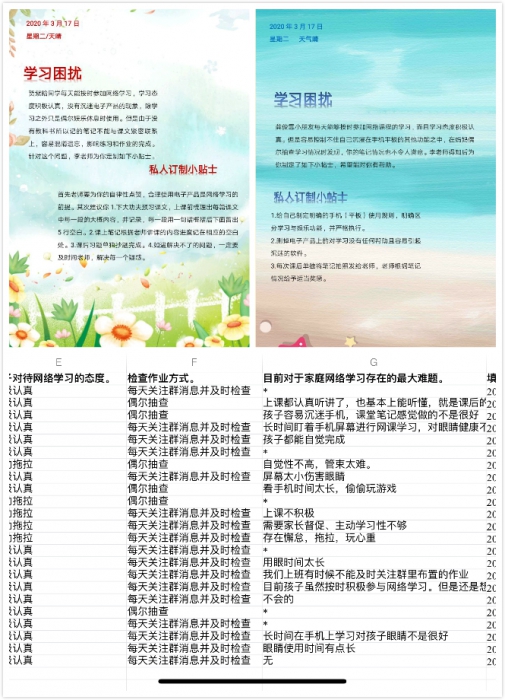 网络时代的教育方式更加新颖、灵活。304班提前利用问卷小程序,收集学生落实网络学习的基本情况,以及家长们疫期网络学习遇到的难题。通过问卷,老师可以详细了解每个学生上网课的时间、态度、家长检查等情况,然后给每位同学制定“私人订制小贴士”,给出学习建议,并制作成卡片发给对应的家长,帮助家长科学指导孩子居家学习与生活。