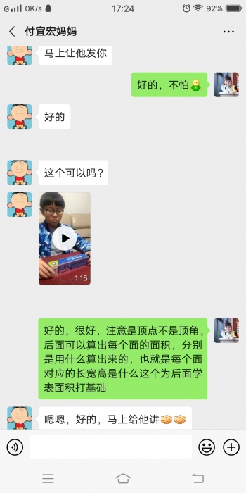 作业发出不久,孩子们纷纷响应,收到了各位“小主播”发过来的解说视频,平时不怎么引起关注的牙膏盒、纸巾盒、食品盒…等一系列长方体就被“小主播”们展示在了我们面前。本次的视频作业也得到了家长们的一致好评,觉得这样的形式既能考验孩子们对知识点的熟练掌握,又能锻炼他们的口头表达能力和应变能力,觉得要多多布置像这类的作业。
