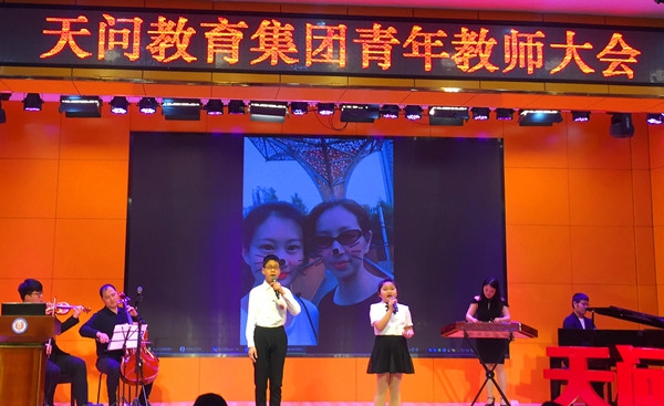 5月10日正值西方的“母亲节”。集团为青年教师们献上特别的礼物,屏幕上滚动播出青年教师与母亲的合影,伴随着动情的童声“天之大”和天问集团各学部音乐教师的亲情伴奏。让在座的各位青年教师热泪盈眶又欣喜若狂。