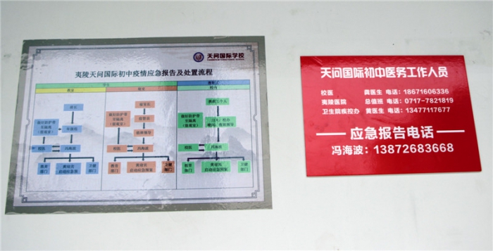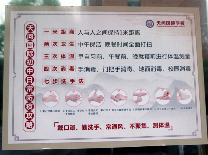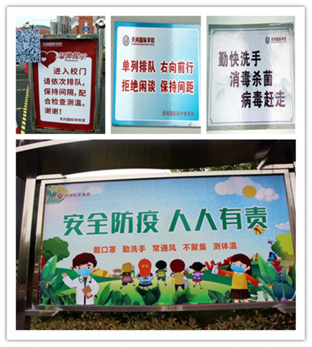 完善“两案十二制”,周密部署,措施齐全;消毒水、额温枪等物资准备充足;教室、寝室、公共区域全面彻底消杀;防疫提示语、紧急状况应急处置流程等随处可见……