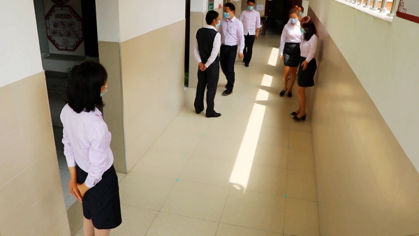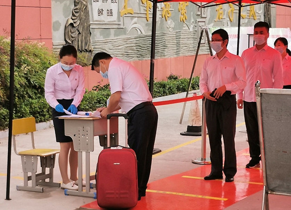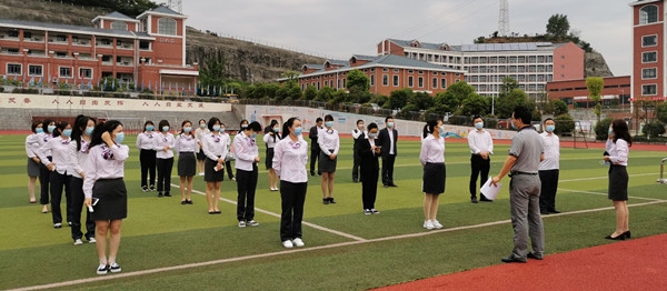 演练前,高新天问初中王发双主任对参加演练的老师在操场上进行演练培训。5月13日上午9点整“学生”们按照1米距离间隔列队,“学生”进入后不仅要经过测体温、消毒,还要通过手机扫码认证后才可进入。整个过程精细到入校、教师上课、食堂就餐、课间如厕、寝室就寝、操场体育锻炼的每一个环节进行演练。