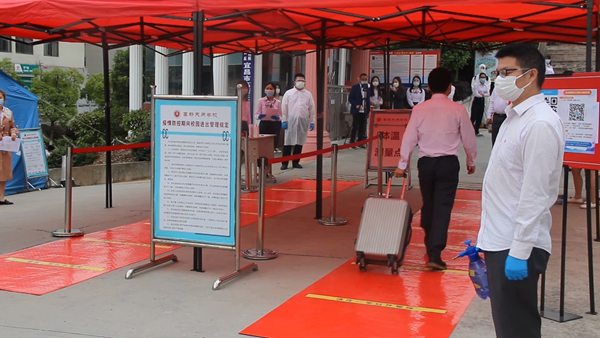 在隔离室内给体温异常的学生复查体温