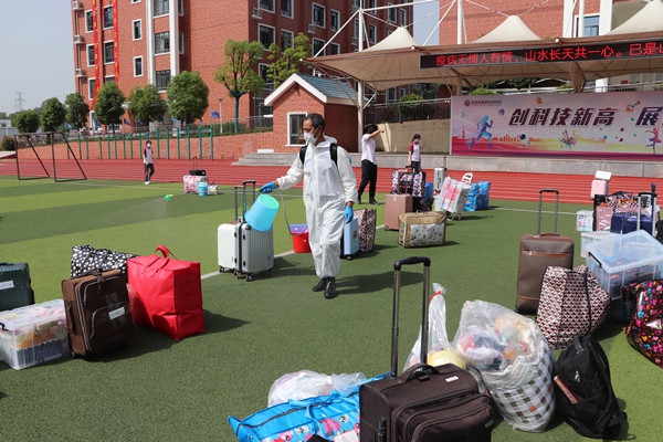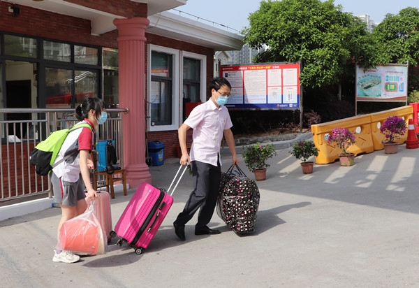 由于我校是寄宿学校,学生行李较多,考虑到安全问题严禁家长进入校园。我们的老师和生活老师化身“搬运工”将学生行李搬至操场,集中消毒再搬入寝室。