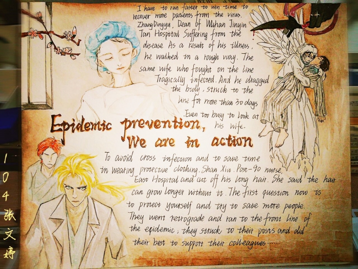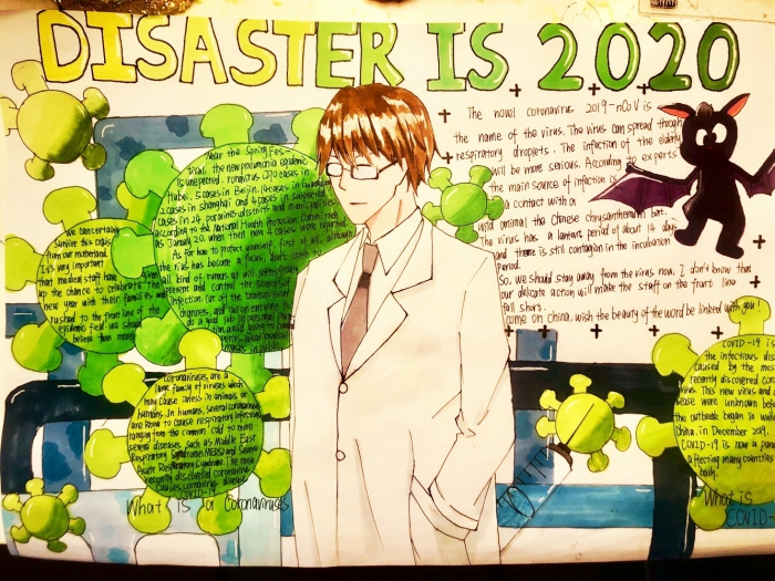 高一学子将居家的学习生活,感人事迹以及防疫小知识以英语手抄报的形式进行展出。有的以”普及防疫知识“为主题,有的以”最美逆行者“为主题,有的以”众志成城抗疫情“为主题,在孩子们的纸上,描绘了一幅又一幅令人感动、充满温情的画面。独特的构思、绚丽的色彩、丰富的内容大概是孩子们对“逆行者”最崇高的敬意吧!