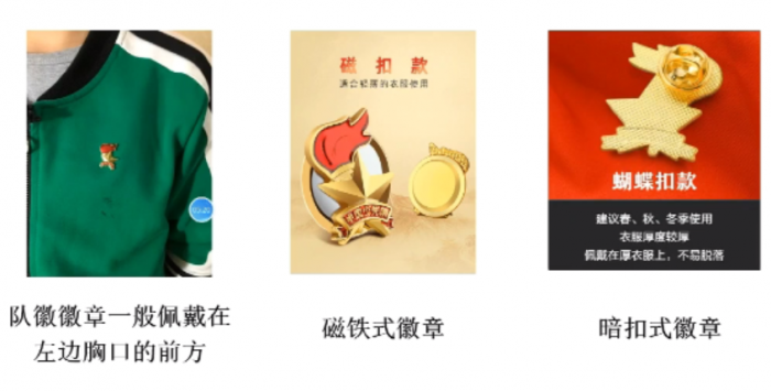 小小一枚队徽,有大大的讲究。通过今天的讲解,大家知道了队徽的含义及使用,请大家一定将这些知识牢记心中。队徽还可制作成徽章供队员佩戴。徽章的规格为高2.2厘米,宽1.8厘米。为确保队员佩戴的安全,徽章须制作成按扣式或磁铁吸扣式。大家一定谨记,不要佩戴、购买不规范的队徽徽章。