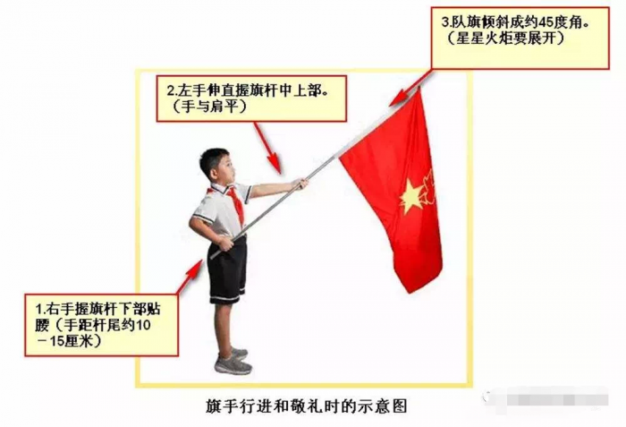 同学们,等你们将来成立中队后,也要争当光荣的小旗手哦!下面就让我们一起学习一下正确的执旗方法吧。一名少先队员旗手和至少2名少先队员护旗手组成旗手组合。旗手右手握旗杆,下部贴腰,左手伸直握旗杆中上部,队旗倾斜成约45度角。