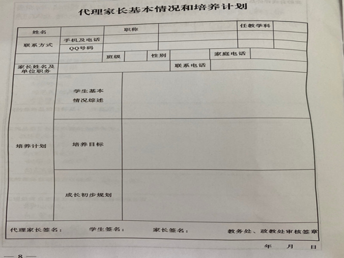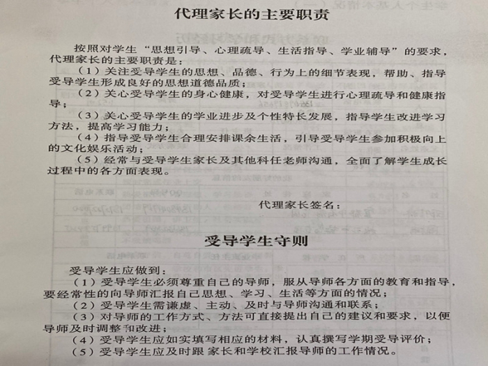 “代理家长”制度深受学生喜爱,从高一开始,班主任会对学生进行摸查,根据学生的性格、学习情况、家庭状况等,将其合理地分配到指定老师。同样,学生根据需要也可适时选择自己喜欢或熟悉的老师,实现双向选择。“代理家长”负责不定时对学生的学习、生活及心理进行辅导,直至高中毕业。
