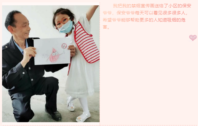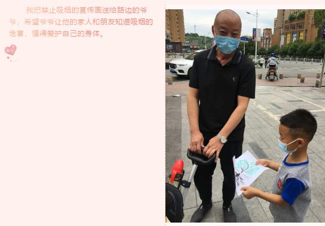 我们和老师一起了解了吸烟的危害,并和爸爸妈妈用手中的画笔绘制出了“禁止吸烟”的宣传画,让更多的人知道吸烟不仅危害自己的健康还会危害到他人的健康。