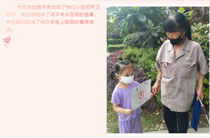 为此我们向亲爱的爷爷、奶奶、爸爸、妈妈、叔叔、阿姨发出倡议“创建无烟环境,我们共同行动!”拥有健康幸福的生活,是我们每个人的心愿,我们相信,为了您和您家人的健康、为了我们的绿色地球,您一定要远离烟草,为全社会营造一个健康的生活环境。让我们共同行动吧!