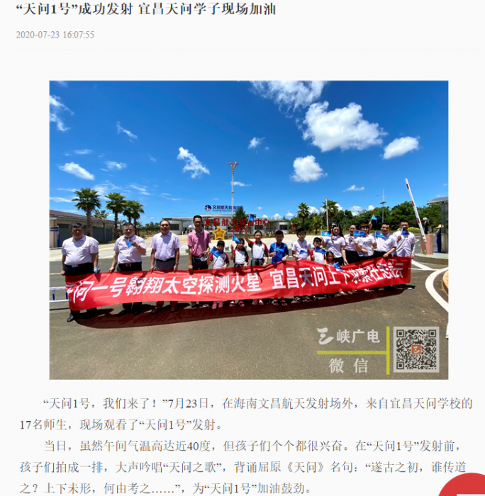 7月23日,在海南文昌航天发射场外,来自宜昌天问教育集团的17名师生,现场观看了“天问1号”发射。