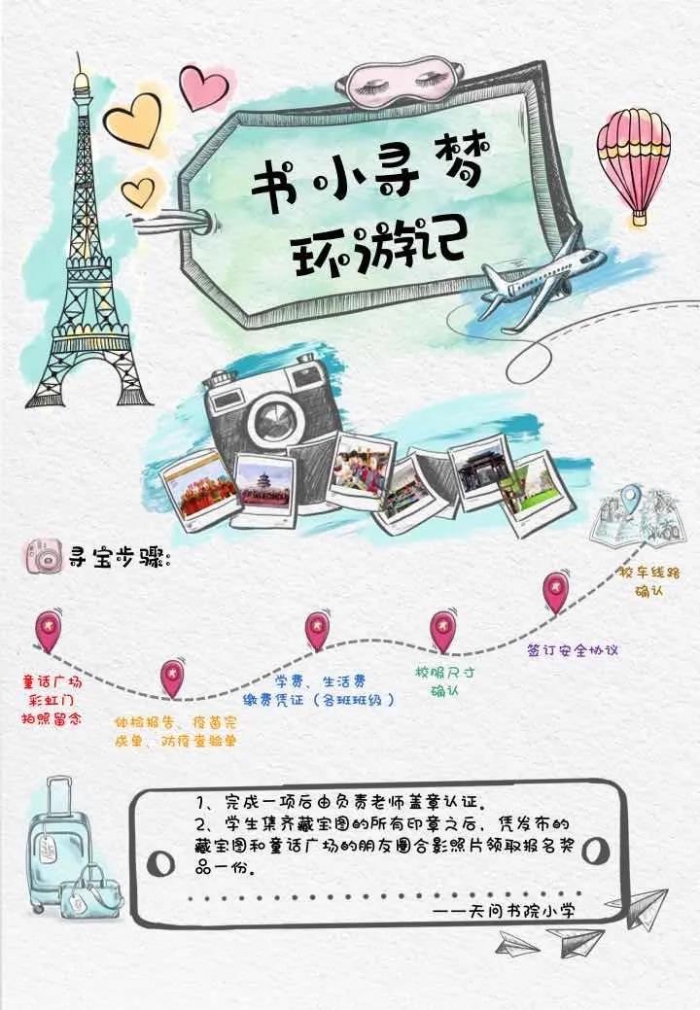 书院小学门口领取宝藏图——童话广场彩虹门拍照留念——进入班级——上交体检报告、疫苗完成单、防疫检查单——上交学费、生活费、缴纳凭证——确认校服尺寸——签订安全协议——校车线路确认——在班主任处兑换宝藏