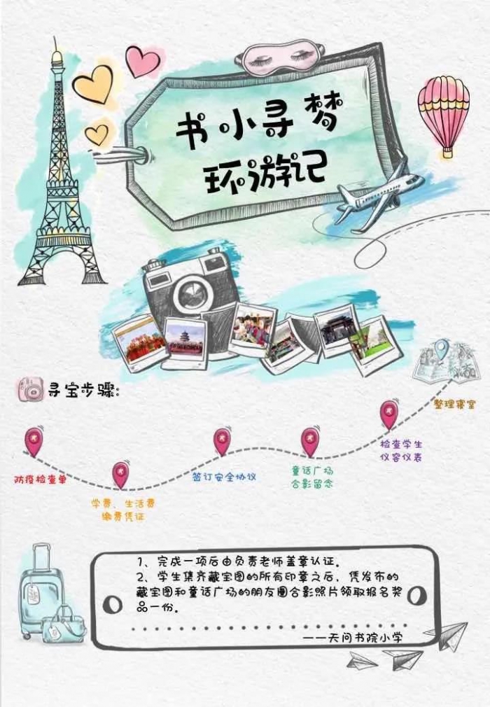 书院小学门口领取宝藏图——进入班级——上交防疫检查单——上交学费、生活费、缴纳凭证——签订安全协议——童话广场合影留念——检查学生仪容仪表——整理寝室——在班主任处兑换宝藏