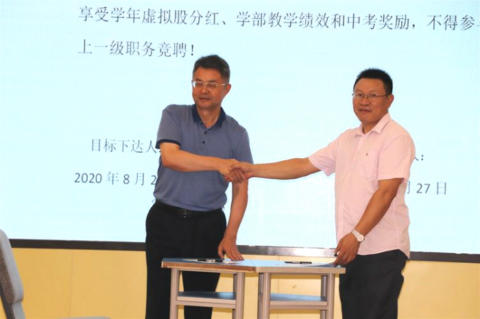 在集团人力资源部部长杨武的主持下,集团总校长高正华与高新天问初中执行校长廖圣东签订了目标责任书。高校长激励大家,幸福是奋斗出来的,要进一步提升教学质量,要为全体学生做好服务,要用决胜的气魄挑战未来。