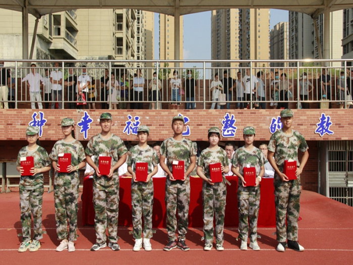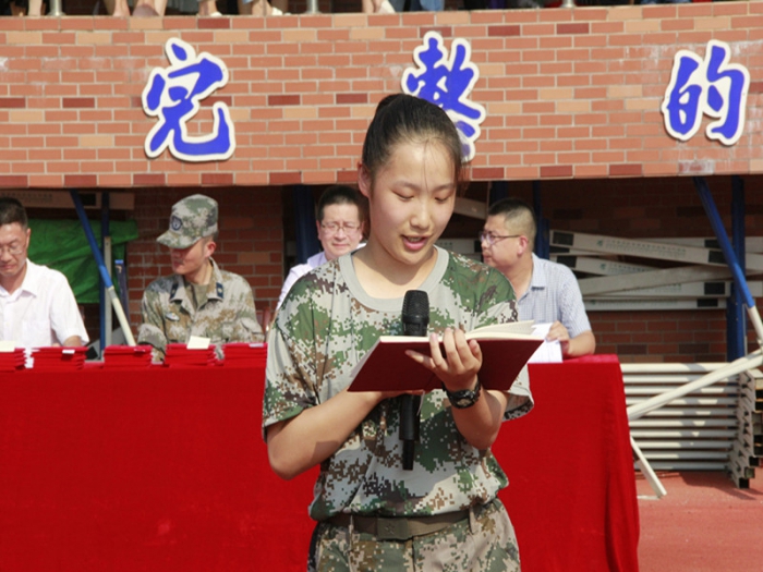 会操表演后,108 班梅景茉雪同学代表全体高一学生分享了她在军训期间的收获和感受:军训是一次非常宝贵的经历,在以后的学习生活中,我们也会继续发扬这种不怕苦、不怕累,勇敢迎难而上的军人精神。