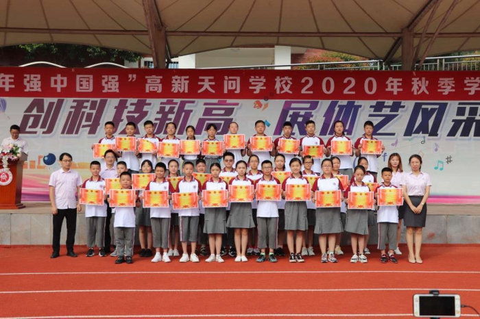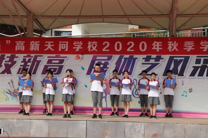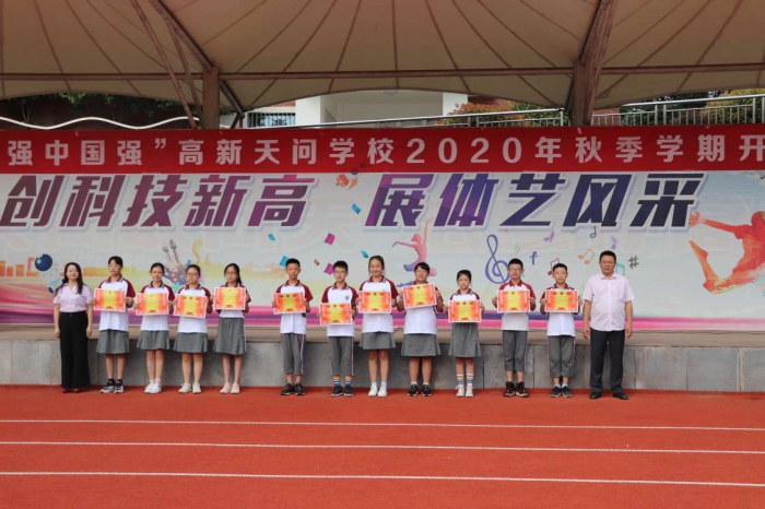 高新天问初中执行校长廖圣东为新学期开学典礼致辞,他说,过去的一学年,全体师生同心协力,开拓创新,喜获2020届初三中考、初二生地会考大捷,再创新初中考新辉煌。新的学期他给学生提了五点希望:“誓以我命固我土”,做一个热爱祖国的人;“善医敢言士无双”,做一个胸怀大志的人;“忠于所爱笃定行”,做一个坚守梦想的人;“节约粮食懂珍惜”,做一个践行文明的人;“少年强,中国强”,做一个热爱科学、勇追梦想的人;并希望全体学生珍惜时光,奋勇前行,努力拼搏,做德智体美劳各方面全面发展的好学生。