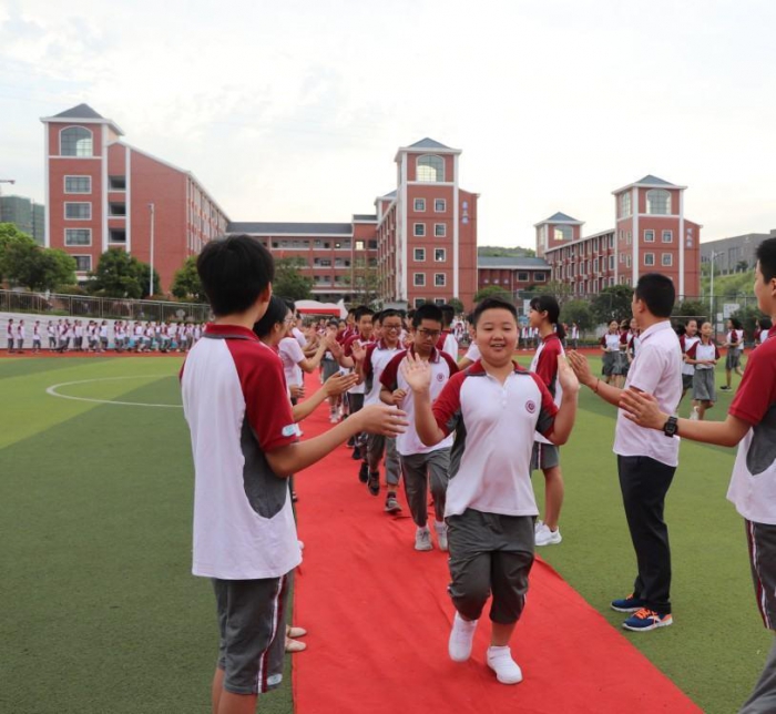 伴随着雄壮的国歌声,五星红旗冉冉升起,开学典礼拉开了序幕。新学期,校园里增添了240余名七年级新生,在击鼓奏乐中,全体老师和八年级学生代表分列“远航门”两侧迎接新生,七年级新生欢快地穿过“远航门”进入会场。