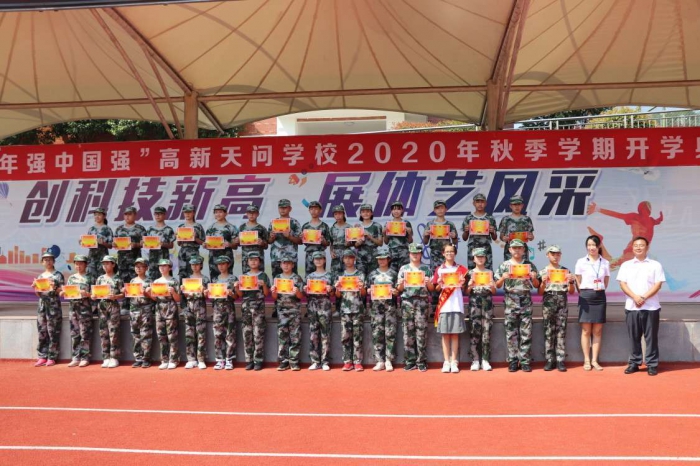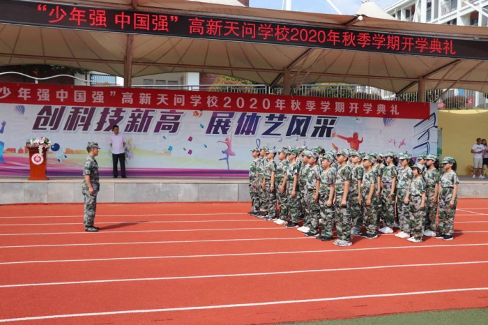 “同学们好,同学们辛苦了!”“吾将上下而求索!”七年级新生们经过军训的砺练,军姿威严、队列整齐。高新天问初中执行校长廖圣东在军训总教官的陪同下走向各个方阵,亲切地向新生问好,全体受训学生以饱满的精神状态接受检阅,嘹亮的回答飘荡在校园上空。