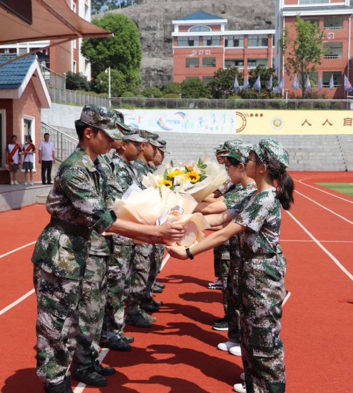 四天的军训虽然短暂,但是学生和教官们却有着深厚的感情。最后,学生代表给每位教官献上鲜花,同学们和教官挥手依依作别。