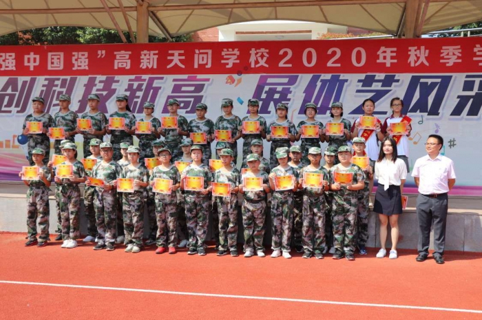 为了磨炼学生的意志,培养学生团结拼搏、勇于进取的奋斗精神,宜昌市高新天问初中七年级新生进行了为期4天的军训,并于9月4日上午举行了拓展训练会操展演。