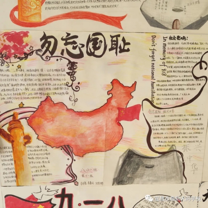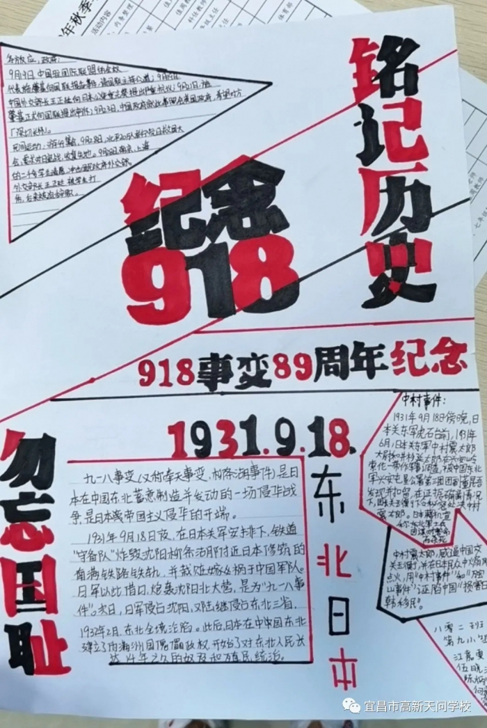 学校组织每个学生办了“九·一八”主题的手抄报,并要求各班召开爱国主义主题班会;语文老师、道法老师、历史老师,以纪念日为契机,对学生进行爱国主义教育。八年级语文组在伍月铭董事的统一安排下,全年级同上一节课;历史老师也统一安排了相关的内容,以查资料、讲故事、看视频等形式了解了1931年9月18日,日本侵略者对中国人民实施的蓄谋已久的侵略暴行,让大家永远记住“九一八”这个屈辱的日子,从而勤奋学习、严于律己,用实际行动肩负起实现中华民族伟大复兴的历史重任。