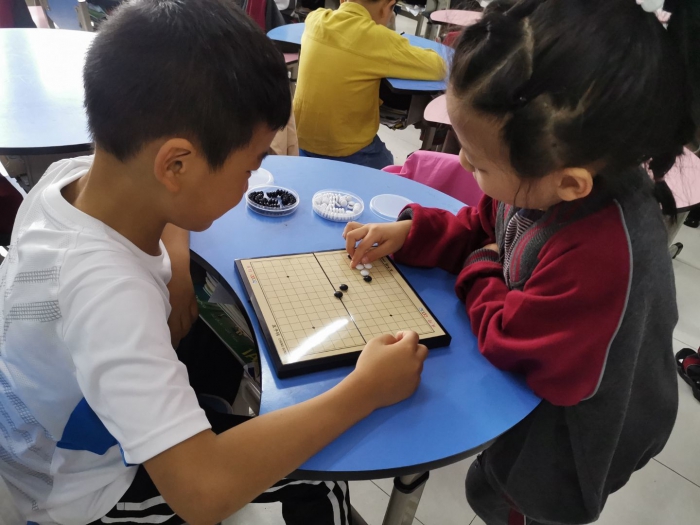 在教室的书柜处设有图书角,教室后方设有活动区域。教室的图书角和活动区给孩子们提供了丰富的课间活动,孩子们可以阅读,下棋,还有各种益智小玩具,一到课间时间孩子们可以选择自己喜欢的活动。无论是图书角还是活动区都有同学负责管理,可以培养孩子们的收纳习惯。参加课间活动同时学会收纳也是对孩子生活习惯的培养。