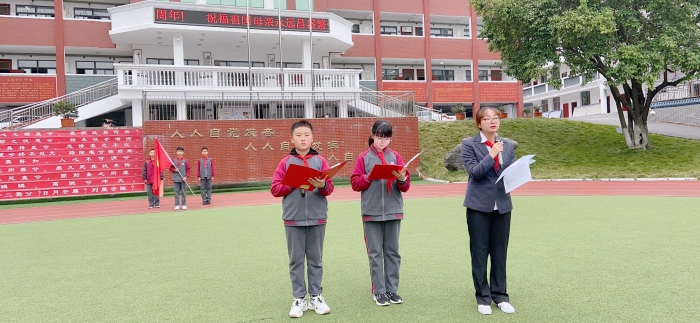 “升国旗,唱国歌,敬队礼”,伴随着节奏鲜明、庄严有序的出旗曲,精神抖擞的旗手将国旗缓缓升起。接着手擎少先队队旗的旗手伴随着少先队出旗曲,步伐整齐的迈向主席台。