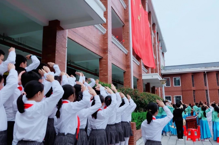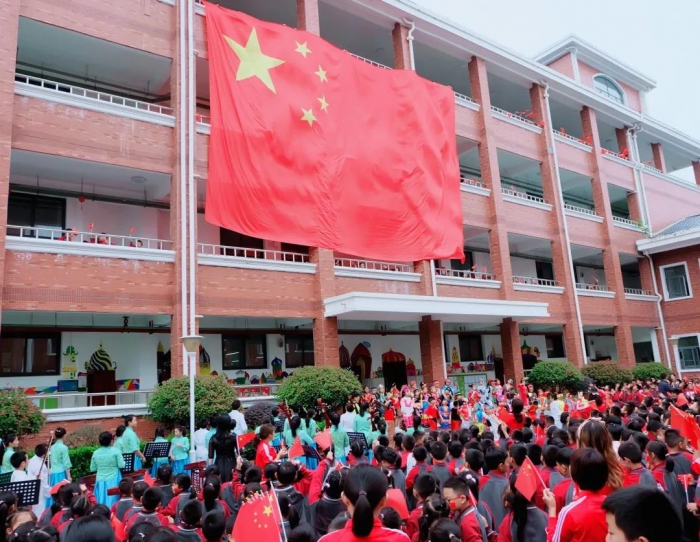 12米长的巨型国旗从楼顶降落,将全场的氛围推向高潮,同学们跟随着音乐,挥舞着手中的小国旗,放声歌唱……
