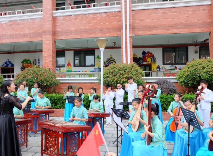 民乐团的同学弹奏《我和我的祖国》,恢弘大气,振奋人心,让在场的每一位师生从心底油然而生出一种民族自豪感。