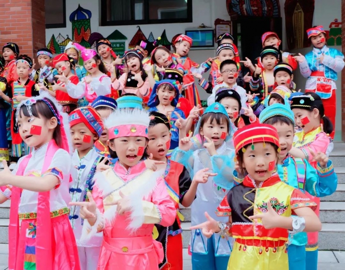 56个一年级的小朋友穿上56个民族服饰,摆成“71”造型,为祖国妈妈献上了一段手语舞。