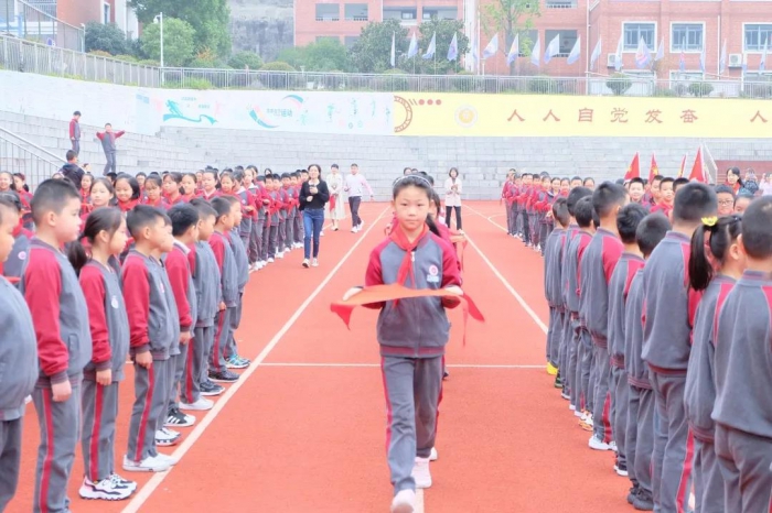 旗手昂首挺胸,手握队旗,迈着坚定铿锵的步伐进行庄严的出旗仪式,鲜艳的红领巾在胸前飘扬,星星火炬在队旗上闪光。全体少先队员举起右手,庄严敬礼。在队旗下,全体队员齐唱《中国少年先锋队队歌》,嘹亮的歌声,萦绕着整个会场,唱出了每位队员心中的自豪与骄傲。